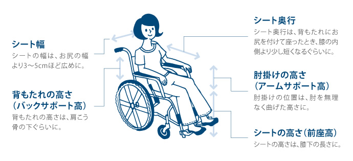 車いすを使用していると、徐々に気になる箇所が出てきたり、太ったり、痩せたり、また、季節によって衣服の厚みできゅうくつになることがあります。専門工具を使用せずに、座面の高さや座幅の調整などが簡単にできる車いすを選ぶとよいでしょう。